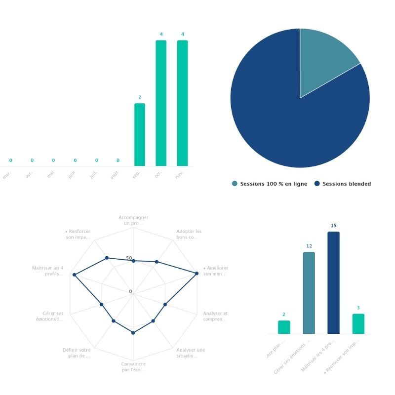 L'interface LMS COACHINSTORE nous offre la possibilité par le biais de mesures, d’indicateurs ou d’observations d'évaluer le développement de compétences spécifiques et sa satisfaction.